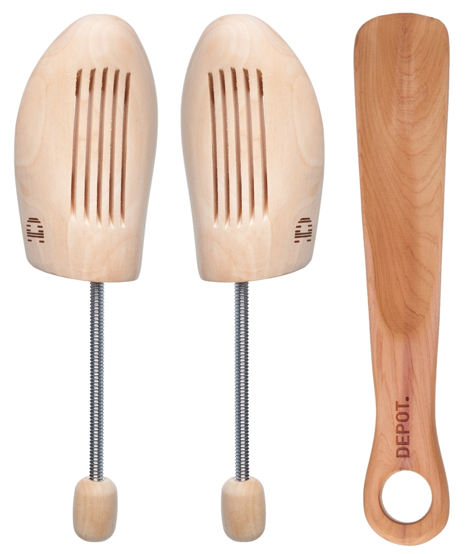Sada napínačov obuvi DEPOT predstavuje inovatívne riešenie na dokonalé tvarovanie obuvi. Obsahuje 2 napínače obuvi, ktoré dokážu roztiahnuť vašu obuv do šírky aj do dĺžky, čím zabezpečia dokonalé prispôsobenie sa vašim nohám. Drevená časť so skrutkou zaručuje roztiahnutie zadnej časti topánky, čím sa eliminuje nepríjemný tlak na pätu.