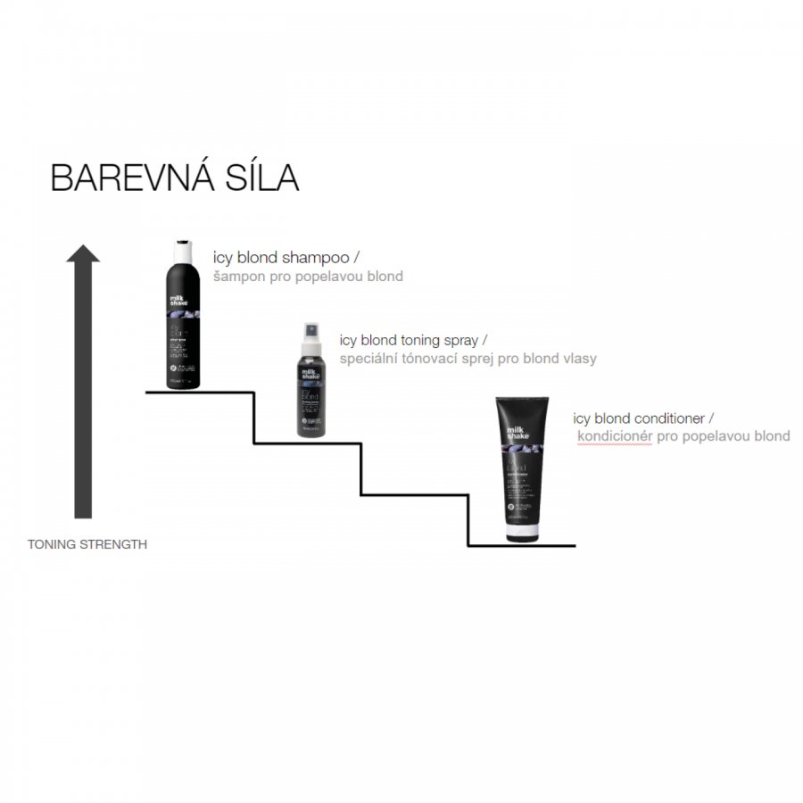 Jedinečný sprej vyvinutý so špeciálnym čiernym pigmentom, ktorý neutralizuje nežiaduce medené a žlté odtiene. Dodávam vlasom popolavé tóny. Posilňuje a hydratuje vlasy, dodáva im zdravý a žiarivý vzhľad, rozčesáva ich a zlepšuje ovládateľnosť. Pre úplnejšie tónovanie, odporúčame kombinovať s ďalšími produktmi z radu icy blond. Bez parabénov a SLES.