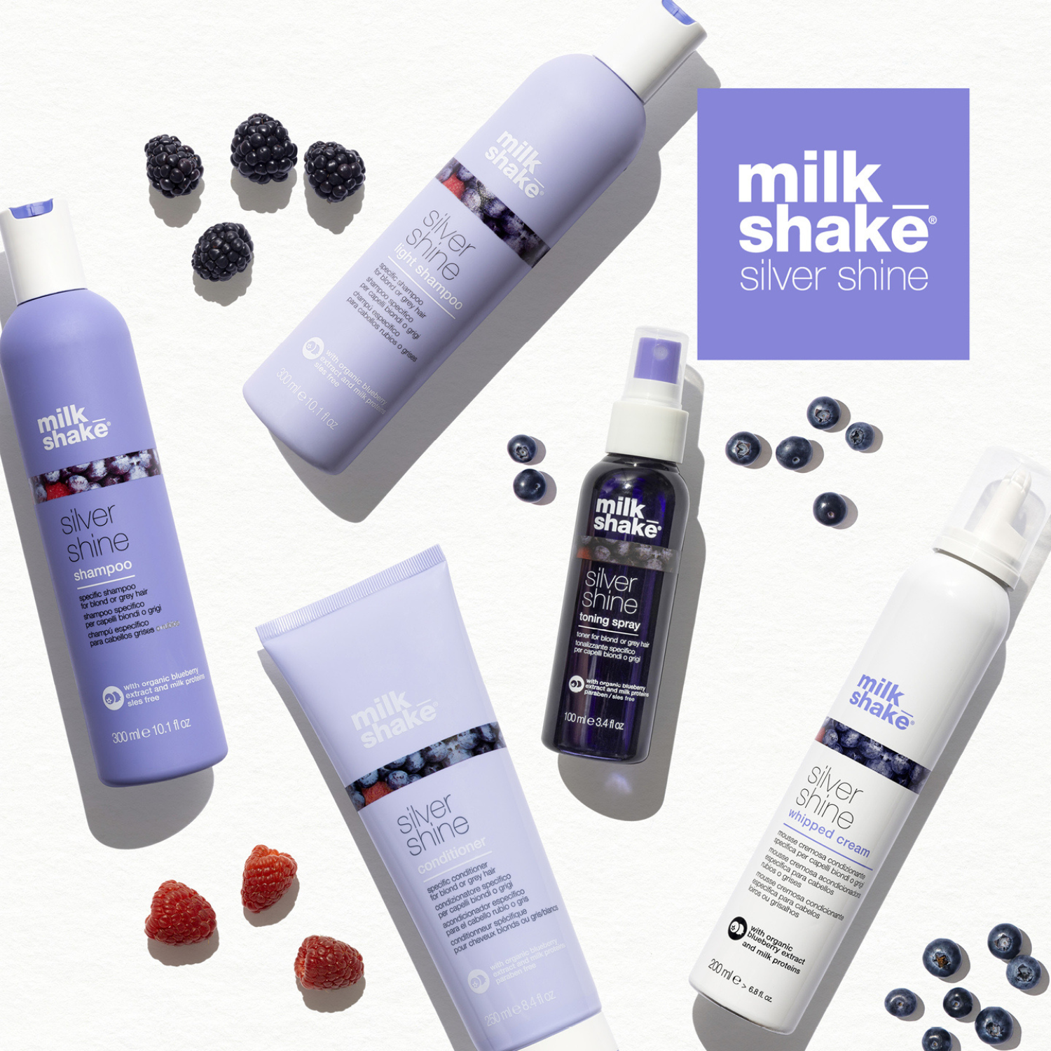 Jemne čistiaci šampón s menším obsahom špecifického fialového pigmentu, ktorý potláča žlté tóny pri odfarbených alebo šedivých vlasoch. Obohatený o organické výťažky so zmesou bobuľovín a mliečnych proteínov pre lesklé, jemné a zdravé vlasy. Bez SLS a SLES. Ideálny pre klientov, ktorí nechcú príliš studený tón vlasov. Obsahuje o 50% menej fialových pigmentov ako šampón Milk_shake silver shine shampoo.